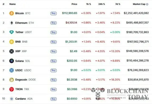 15日午前9時45分現在、コインマーケットキャップによると、ビットコイン(BTC)は前日同時刻比1.97%安の11万2993ドル(約1710万円)を記録。主要暗号資産はいずれも軒並み下落している。