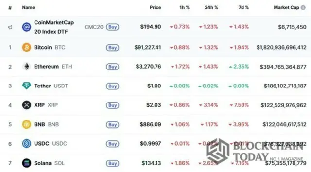 11日午前9時50分時点、コインマーケットキャップによると、ビットコインは24時間前比1.32%安の9万1227ドル(約1419万円)となっている。